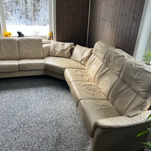 Skinnsofa fra Hjort Knudsen selges. Gått opp i sømmen i den ene sitteputen (se bilde) , men vil anta noen med litt sy erfaring kan få lappet det sammen :)