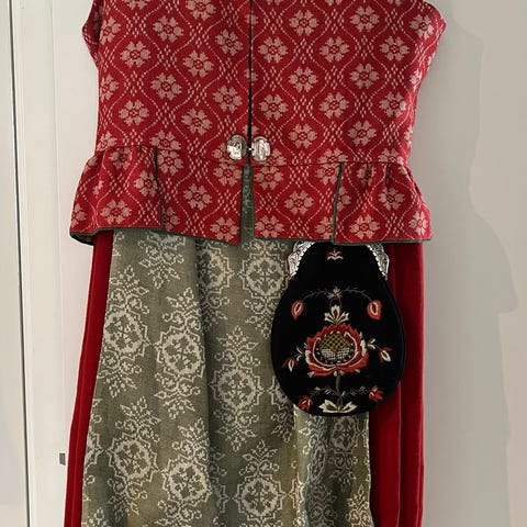 Veske på du ser på bilde er ikke original, men kan følge med om ønskelig. Bunaden befinner seg I Trondheim og kan prøves der.