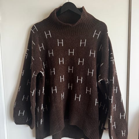 HÉST genser i ull for dame i størrelse M. Genseren er grå med mønster av H-bokstaver over hele. Den har høy, ribbestrikket hals og ribbekanter nederst og på ermene. Passformen ser ut til å være romslig og lengden noe forlenget, egnet til bruk over bukse eller tights. Materialet er ull, som gir et varmt og mykt plagg til hverdagsbruk eller som lag over andre klær i kaldere vær.