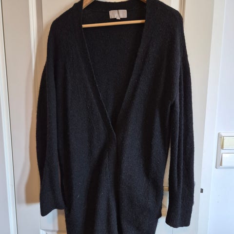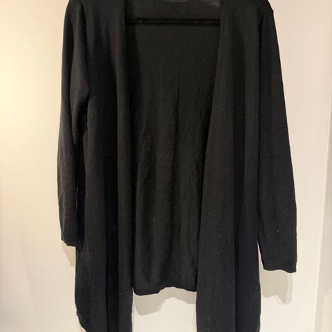 InWear Pakako cardigan i størrelse M. Langermet, åpen modell i svart farge med lommer foran. Materiale ifølge lappen er hovedsakelig viskoseblanding (72 % viskose og 28 % polyamid/polyester). Cardiganen egner seg godt til bruk over topper, skjorter eller kjoler til hverdags og jobb.
