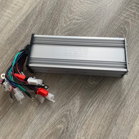 Kontroller til el-sykkel med tilhørende kabelsett og kontakter. Enheten har kjøleribbekapsling i metall og flere fargekodede ledninger med ulike plugger for tilkobling av motor, strømforsyning og styrekontroller. Egnet som erstatningsdel eller komponent i elektrisk sykkelsystem der spesifikasjonene samsvarer med eksisterende oppsett. Nøyaktige tekniske data som spenning, effekt og kompatible modeller bør kontrolleres mot merkingen på kontrolleren før bruk.