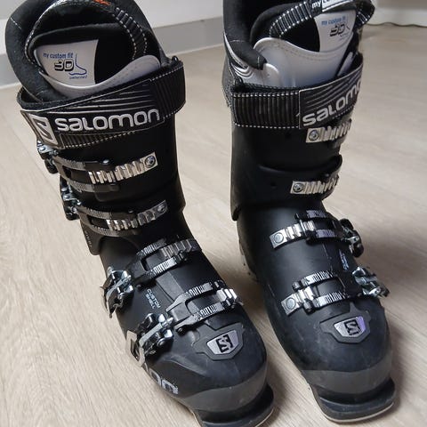 Salomon Shift Pro 90W (Dame) alpinstøvler i størrelse 22/23,5 med sålelengde 276 mm. Ca 37. Modellen er i hovedsak svart med rosa detaljer. Støvlene har fire justerbare spenner og powerstrap.