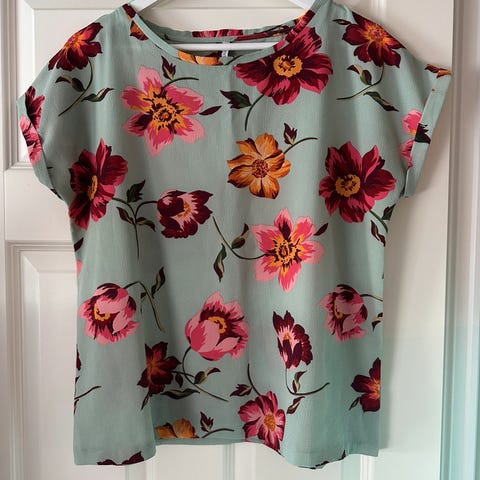 InWear topp i størrelse M. Toppen er flerfarget med blomsterprint på grønn bunn. Materialet er viskose, som gir et mykt og lett stoff. Ensfarget grønn på baksiden. Modellen har rund hals og korte ermer, og passer til hverdagsbruk eller som en enkel topp til bukser eller skjørt.