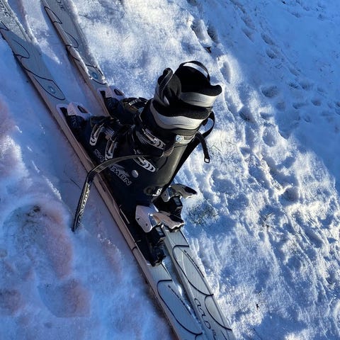 Rossignol alpinski med bindinger og staver, samt Dalbello alpinstøvler i størrelse 245 (sålelengde 285 mm). Skiene har lengde 130 cm. Skistøvlene er svarte med gule detaljer og flere spenner for justering. Svært lite og pent brukt
