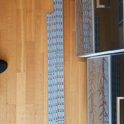 Elfa hyller i hvitlakkert metall. Perforerte hyller egnet for bruk i garderobe, bod eller andre oppbevaringsløsninger. Kan monteres i Elfa-systemer for å gi luftig og stabil oppbevaringsflate for klær, sko eller diverse utstyr.
