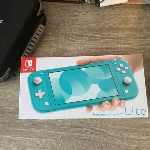 Nintendo Switch Lite spillkonsoll i grå farge. Håndholdt modell med integrerte kontroller og skjerm i midten. Konsollen leveres sammen med et beskyttende etui med glidelås og innvendig nettinglomme for oppbevaring av tilbehør som for eksempel ladekabel og spillkassetter. Egnet for håndholdt spilling hjemme eller på reise.