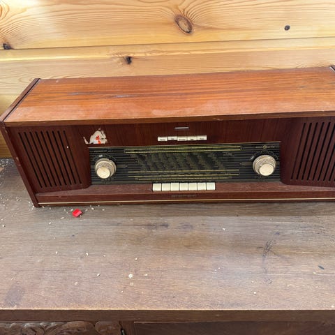 Vintage bordradio i treverk fra 1930’s -1940’s. Radioen har klassisk front med stoffdekket høyttalerfelt, skala for radiokanaler og fire betjeningsknapper på fremsiden. Bakside med åpning som viser elektronikk og rørkomponenter. Egner seg som samlerobjekt eller dekorativt innslag i interiør. Funksjonsstatus er ukjent . Fint for pynt/ restaurering ..