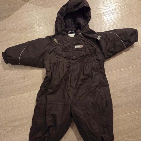 Reima tec vinterdress i størrelse 80. Den har avtagbar hette og to glidelåser i front for enkel av/på. Glidelåsene kan tas helt ned. Innvendig er den vattert for ekstra isolasjon. Refleksdetaljer på ermer og rygg gir bedre synlighet. Noen nupper på det ene kneet, se bilde.
