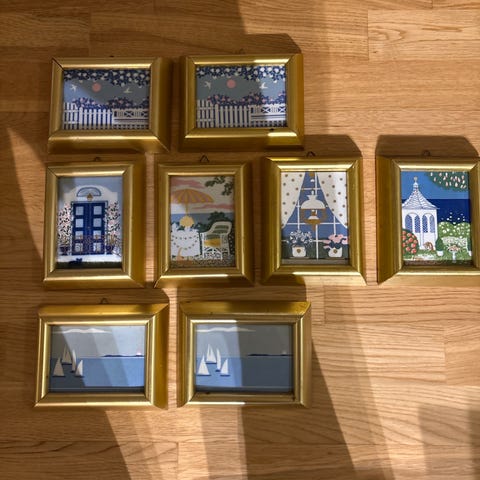 Porselensbilder produsert av Porsgrunds Porselænsfabrik. Normal brukspatina på rammene, ellers hele og pene. Nostalgiske samleobjekter.