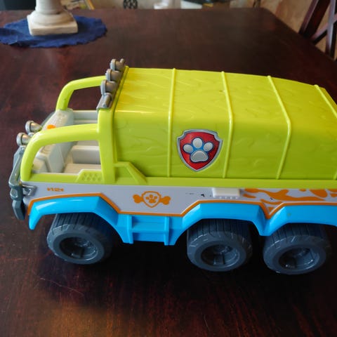 Paw Patrol lekebil lastebil i plast med grønn overdel og blå underdel. Bilen har seks hjul, åpen førerkabin med to seter og påbygg med Paw Patrol-logo på siden. Bak på bilen er det en løftearm med kurv. Egnet som lekekjøretøy for barn som liker Paw Patrol-tema og utelek eller innendørs lek med kjøretøy.