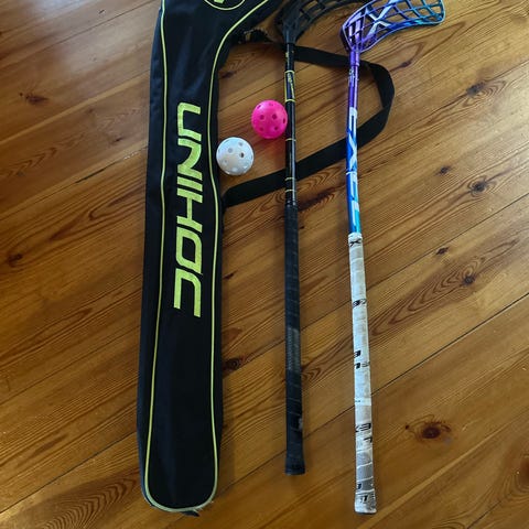 Exel og Unihoc innebandykøller med tilhørende Unihoc køllebag.