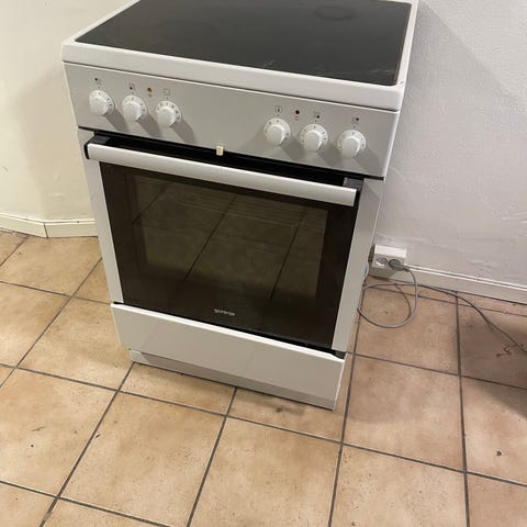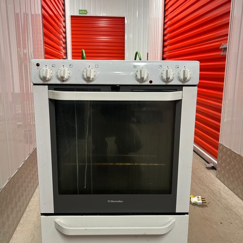 Godt brukt og noe defekt Electrolux keramisk komfyr med stekeovn og keramisk platetopp. Komfyren har fire kokesoner på glasskeramisk topp og stekeovn med rist og stekebrett. Fronten har dreieknapper for betjening av kokesoner og ovnsfunksjoner, samt digitalt display.