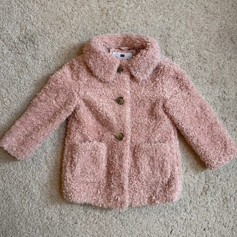 H&M kåpe for jente i størrelse 116. Kåpen er rosa og laget i polyester. Den har knepping foran, to skrålommer og en myk, fuskepels krage. Passer godt til og fra når det er fine anledninger, men kan også brukes i hverdagen. Kåpen kan vaskes på 40 grader.
