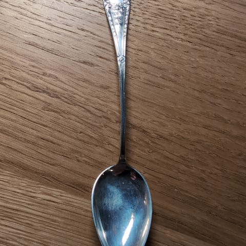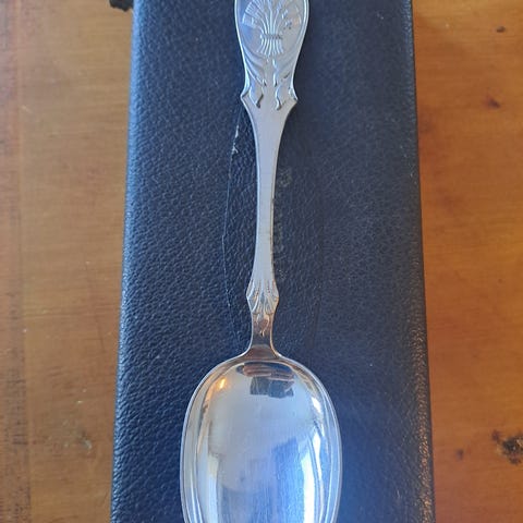 Sølvskje i 830S sølv med mønster rikslløven. Lengden er omtrent 11 cm
