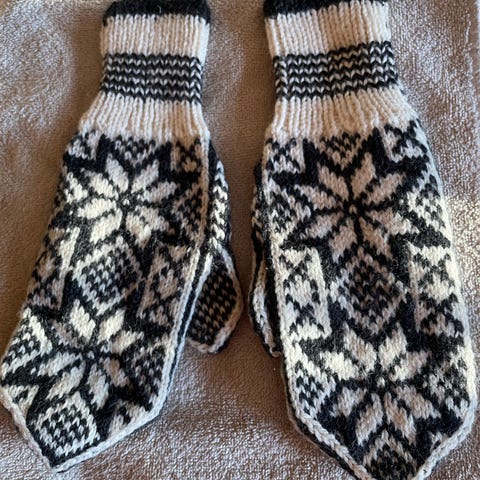 Nye/ ubrukte selbuvotter herre strikket i ullgarn. Grå og hvit/ Marineblå og hvit. Selges 250kr pr stk+ porto.