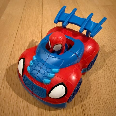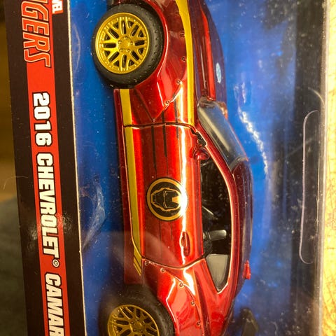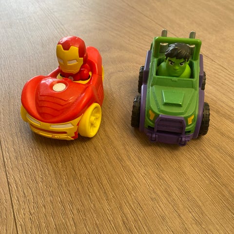Marvel Iron Man lekebil med figur i rød og gul plast. Bilen har store hjul og en Iron Man-figur i førersetet. Egnet som lekekjøretøy for barn som liker superhelter og actionfigurer. Passer til innendørs lek på gulv og andre jevne underlag.