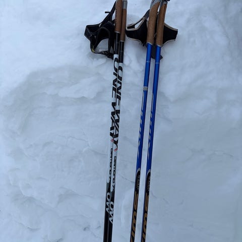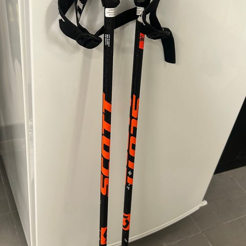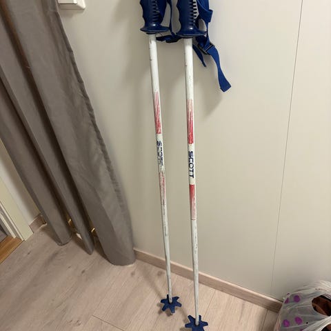 Scott Ex-TQ alpinstaver i blå farge. Stavene har plastgrep med håndstropper og store trinser. Egnet til alpint bruk. Lengde fremgår av bildene med målebånd ved siden av stavene.