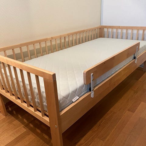 Pen juniorseng fra Jollyroom i hvit farge. Pent brukt med noen få bruksmerker. Sengen har sengehest på begge sider og spiler i både hode- og fotende. Bunn består av lameller i tre. Passer som overgangsseng mellom sprinkelseng og vanlig seng for barn. Passer til 70 x 140 madrass.