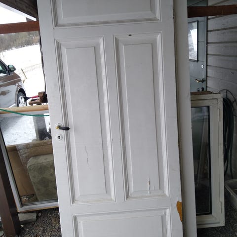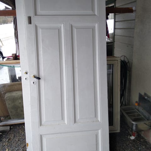 Innerdør i tre, malt hvit. Døren har klassisk fyllingsdesign med tre rektangulære felt og metallhåndtak. Egner seg som innerdør i bolig, for eksempel til soverom, gang eller bod.