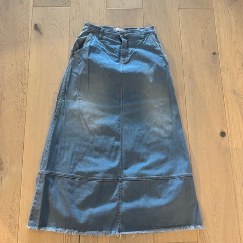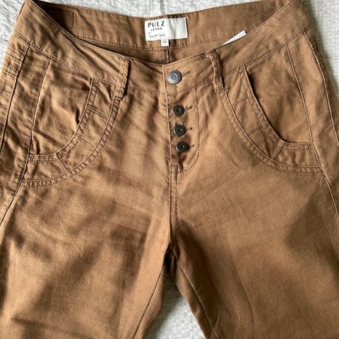 Skjørt fra Please i størrelse L, men er nok litt stort i størrelsen. Brunt i farge, men i en tone som minner mer om cognac. Skjørtet har høy knappelukking med flere metallknapper foran og klassiske lommer både foran og bak. Baklommen har dekorativ søm og lite hjerte-detalj i metall. Stoffet ser ut som semsket skinn, men er laget av polyester og elastan. Stretch.