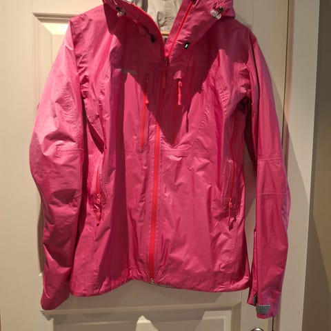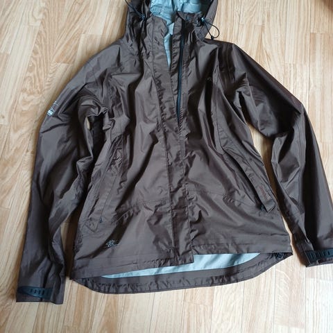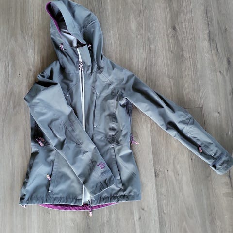 Stormberg regnjakke for dame i størrelse S. Jakken er grå med kontrastdetaljer og glidelåser i en annen farge. Materialet er polyester med glatt innside.