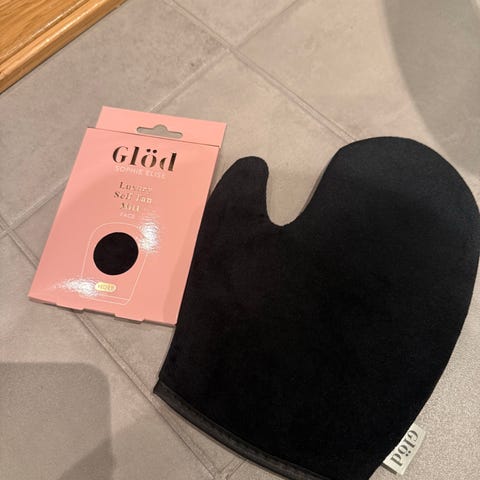 Pent brukt selvbruningshansker selges samlet. Den ene har tommel og er fra sunspa. Den andre er fra sunny stories.