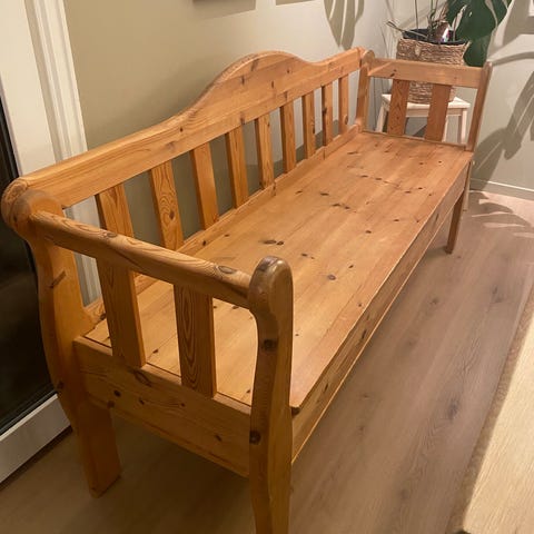 Heltre benk med sittepute som oppprinnelig er retro brunstripete (beige sengeteppe som er brukt som trekk kan følge med). Malt i matt dempet sort. Kan trenge et nytt malingsstrøk. Tidlige eier hadde en hund som har gnaget på ene armlenet (se bilde).