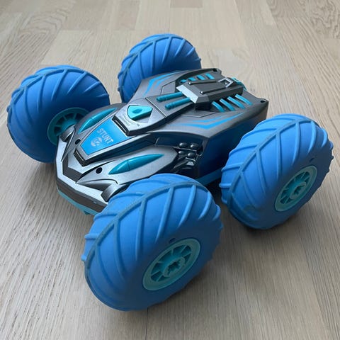 Maisto RC-bil med trådløs fjernkontroll. Bilen er blå med store terrenghjul og grønn felgkant.