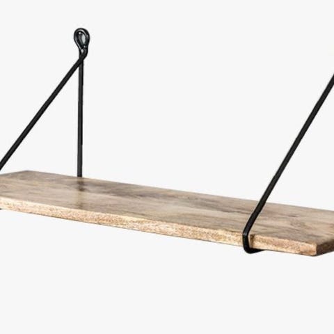 Hyllene er i eik, med svarte stenger,pent brukt til oppbevaring av bøker,
