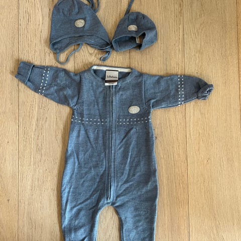 Lillelam ulldress i brun farge i størrelse 56 for unisex baby med tøfler i str. 62-68. Heldressen har krage og er glidelås foran. Strikket ullmateriale gir god varme og er egnet som ytterlag eller mellomlag for små barn. Passer til bruk i vogn, bilstol eller inne på kjølige dager.
