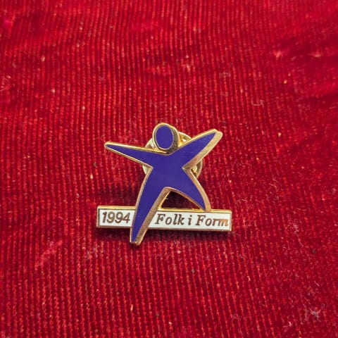 Jeg selger nå den ikoniske "Folk i Form til OL" (FIFOL)-pinsen fra selve OL-året 1994. Dette er ikke bare en hvilken som helst liten metallbit; det er et symbol på den enorme folkefesten og mosjonsbølgen som feide over landet i forkant av "the best winter games ever".