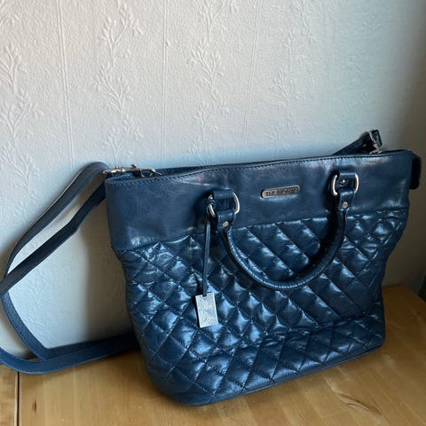 Don Donna håndveske for dame i blått, krokopreget materiale. Vesken har to korte bærehåndtak og en avtakbar, justerbar skulderrem. Den har flere separate rom med glidelåslukking og en utvendig glidelåslomme på baksiden. Innvendig er det flere rominndelinger som gjør det enkelt å organisere innhold som lommebok, mobil, nøkler og småting .
