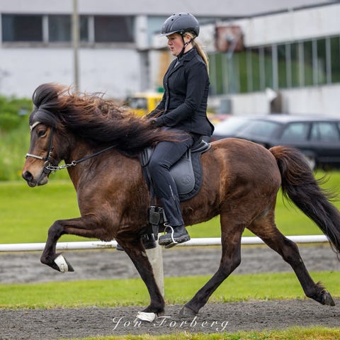 Han er grei i flokk og har blitt ganske bra i trafikken, men han trenger en stødig hånd. Ikke sterk og en herlig turhest.