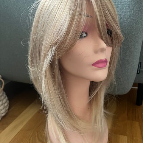 Lang parykk med bølgete hår og lugg. Fargen er lys blond med mørkere røtter. Parykken har lengde ned over skuldrene og er formet i myke bølger. Parykken er av syntetisk kvalitet, den er helt ny. Kan sendes mot frakt og forhåndsbetaling.