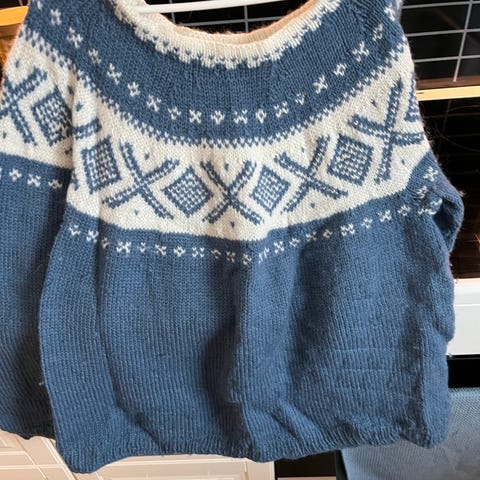 Supersøt hjemmestrikket vest i det som kjennes ut som behagelig, myk ull. Blå med mønster i en lysere blå og dusty rose. Fin både med og uten t-skjorte eller skjorte under. Vil si den er en medium (jeg på bildene er en curvy M), se mål på siste bilder. Like fin til kvinner og menn. Pent brukt, hel og fin, litt nupper som lett kan fjernes. Nyvasket på ullprogram og klar til bruk. 💙