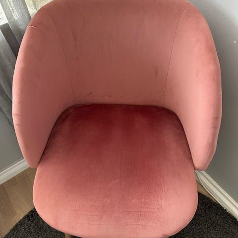 Pen stol i velur. Noen små flekker på setet, ellers i fin stand og lite slitt (mest brukt til oppbevaring av klær på et jenterom). Må hentes på Hisøy.
