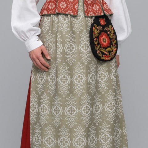Bunaden inkluderer stakk, forkle, vest, veske(uten sølv), skjorte med hvite broderier og klespose selges samlet for kr 30 000