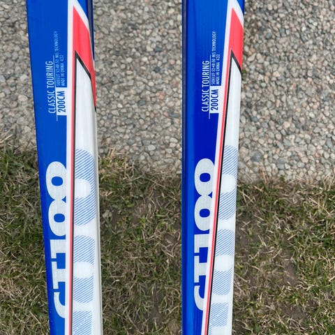 De mørkeblå er 205 og med staver på 145cm. Kr 500,-