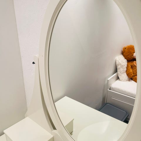 IKEA sminkebord med ovalt speil og oppbevaring. Bordet er hvitt og har to små skuffer på bordplaten, egnet til oppbevaring av sminke, smykker eller andre småting. Bordet står på fire rette ben og har en glatt bordplate. Passer på soverom, garderobe eller som toalettbord i andre rom. Speilet er fastmontert på bordet og gir et godt speilbilde ved daglig bruk.