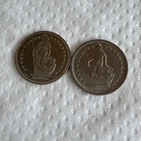 Selger en sveitsisk 5 Franc mynt fra 1968. Klassisk motiv med “Confoederatio Helvetica” på forsiden og sveitsisk skjold på baksiden.