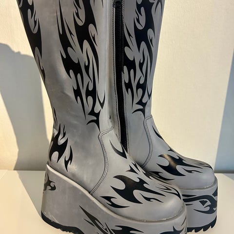 Sky Fairywalker blå holografiske platform sneakers fra Club Exx i størrelse US 9 (tilsvarer 39-40). Pent brukt, men bittelitt slitt på toppen (se nest siste bilde). Dette synes egentlig ikke. Jeg har selv satt på matchende perler på skolissene, men kan tas av om ønskelig.