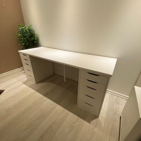 Vi bygger om hjemme og selger derfor vårt fine Malm skrivebord i størrelse 140 x 65 cm. Klassisk design, stabil og romslig – perfekt til hjemmekontor, studier eller ungdomsrom.