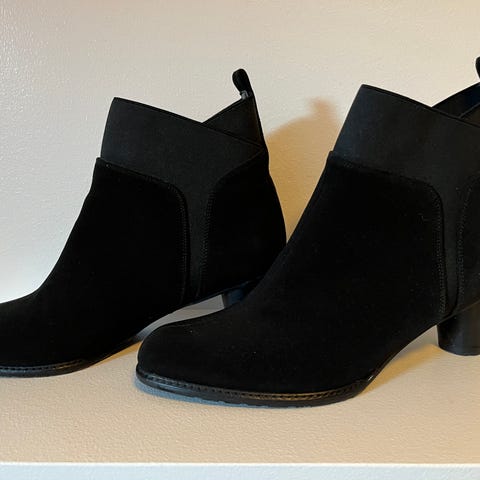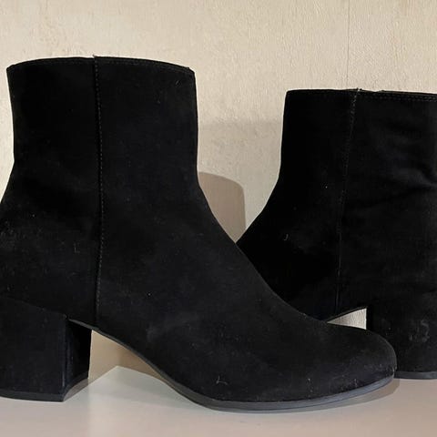 Sorte ankelboots fra Marco Tozzi i semsket skinn med stabil blokkhæl og glidelås på siden.