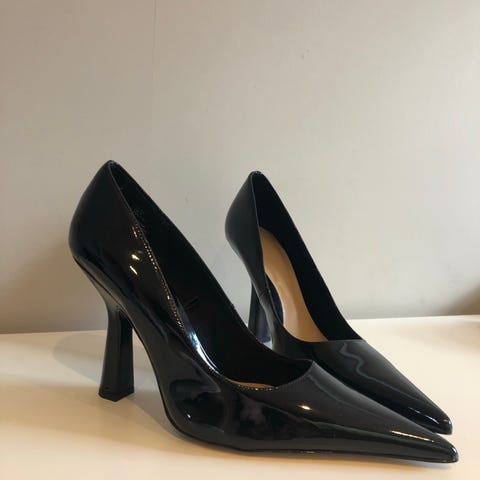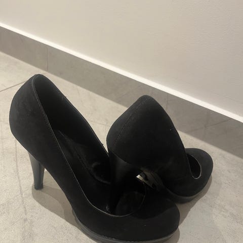 Pensko i størrelse 39, hæl 10 cm . Skoene er svarte med høy hæl og platå foran. Klassisk pumps-modell som passer til bruk ved formelle anledninger, kontor eller fest. Innside i lyst materiale og glatt overflate på hæl og såle. Enkel og tidløs design som kan kombineres med både kjole, skjørt og bukse.