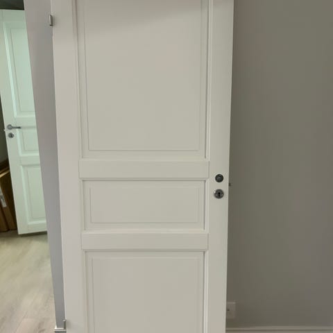 Hvit innerdør med klassiske speilfyllinger. Passer godt som romdeler. Usikker på merke, men dette er en relativt tung kvalitetsdør, ulikt mye av det som leveres i dag. Fra ca. 2008. Nylig malt i farge bomull før vi bestemte oss for å åpne opp mellom kjøkken/stue. Ramme, skinner, hjul etc. skal være inntakt.