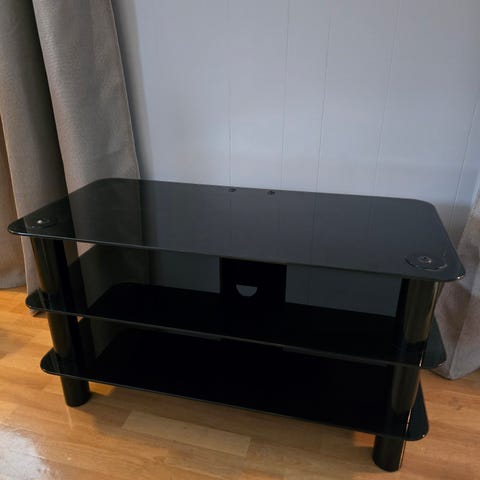 Tv bord kjøpt i USA gis bort. Metall rammeverk med 3 sorte glasshyller.