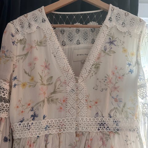 By Malina Alicia Long Sleeve Maxi-kjole. Lang kjole i blått mønster, laget i viskose. Kjolen har dyp V-utringning, lange ermer og avtagbart knytebelte i livet. Skjørtet er langt og lett utsvingt, med splitt foran. Passer som sommerkjole til hverdagsbruk eller mer pyntede anledninger. Brukt to ganger.