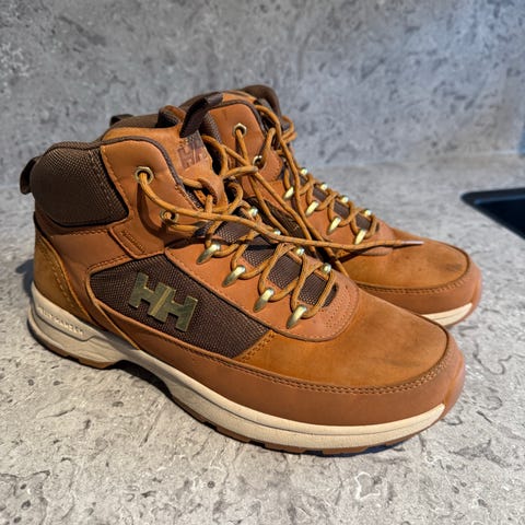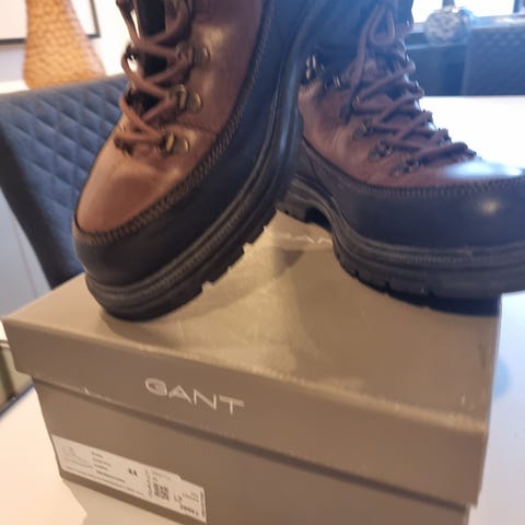 Gant Hillark vinterstøvler i størrelse 43. Støvlene er i brun farge med mørke detaljer og kraftig yttersåle i gummi med grovt mønster. Overdelen er i kombinasjon av tekstil og skinnimitasjon, med snøring og metallhemper for justering rundt ankelen. Fôret er i 100 % bomull ifølge merkelappen. Modellen er ankelhøy og egner seg til bruk i kaldere vær og på variert underlag.