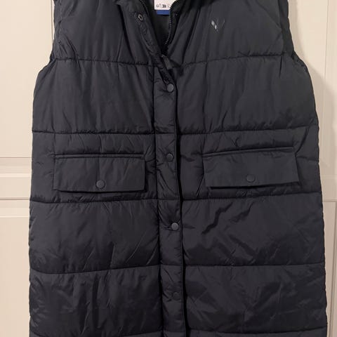 Logo på bryst og knapper. To frontlommer og en innerlomme. 90/10 dunfyll. Knappejustering på ermene.