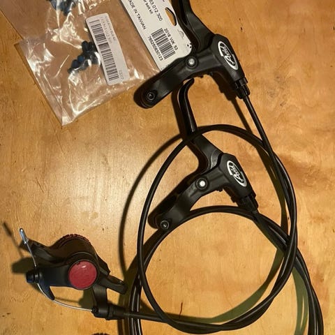 Brukt, men fungerer fortsatt greit. Bremseklossene står fortsatt i.